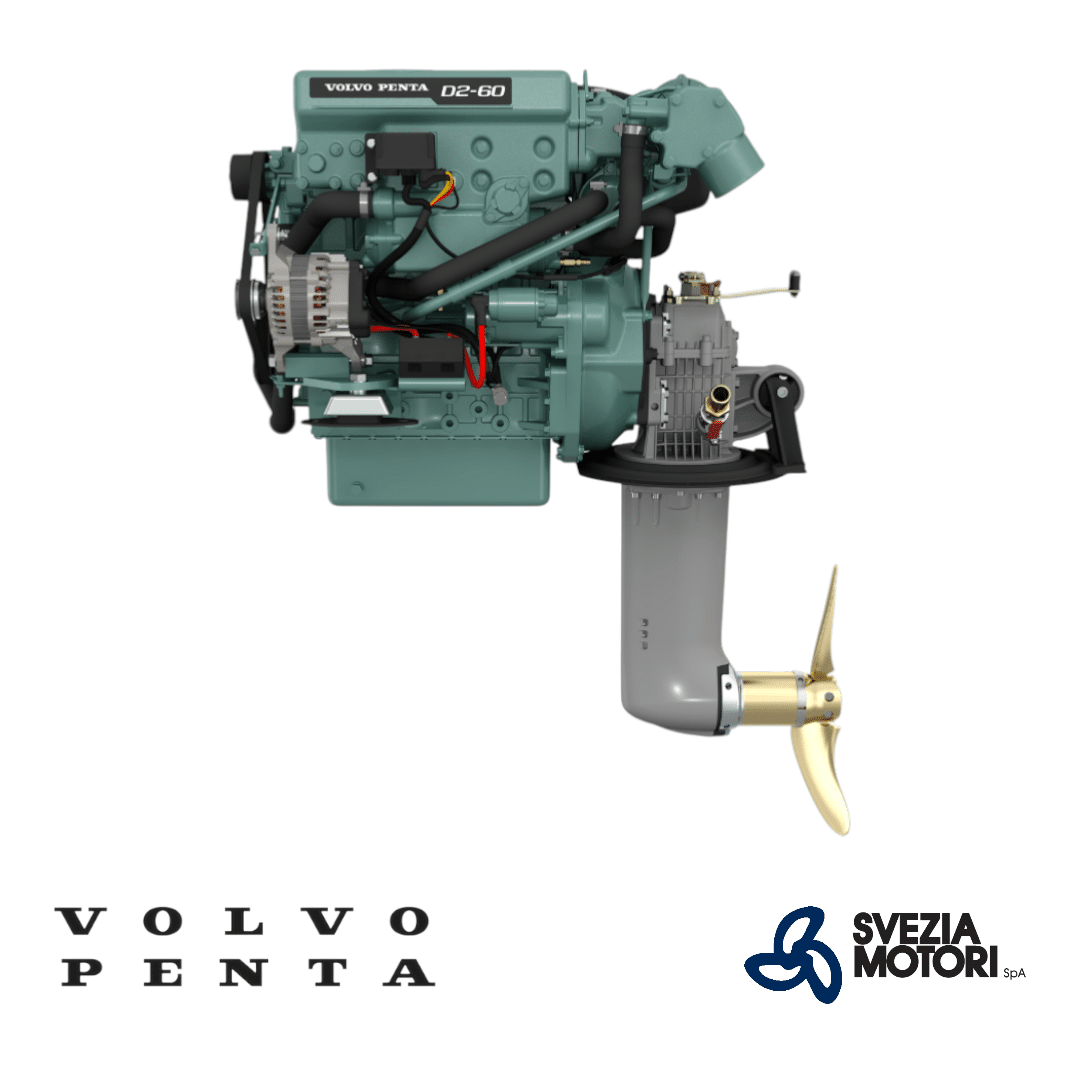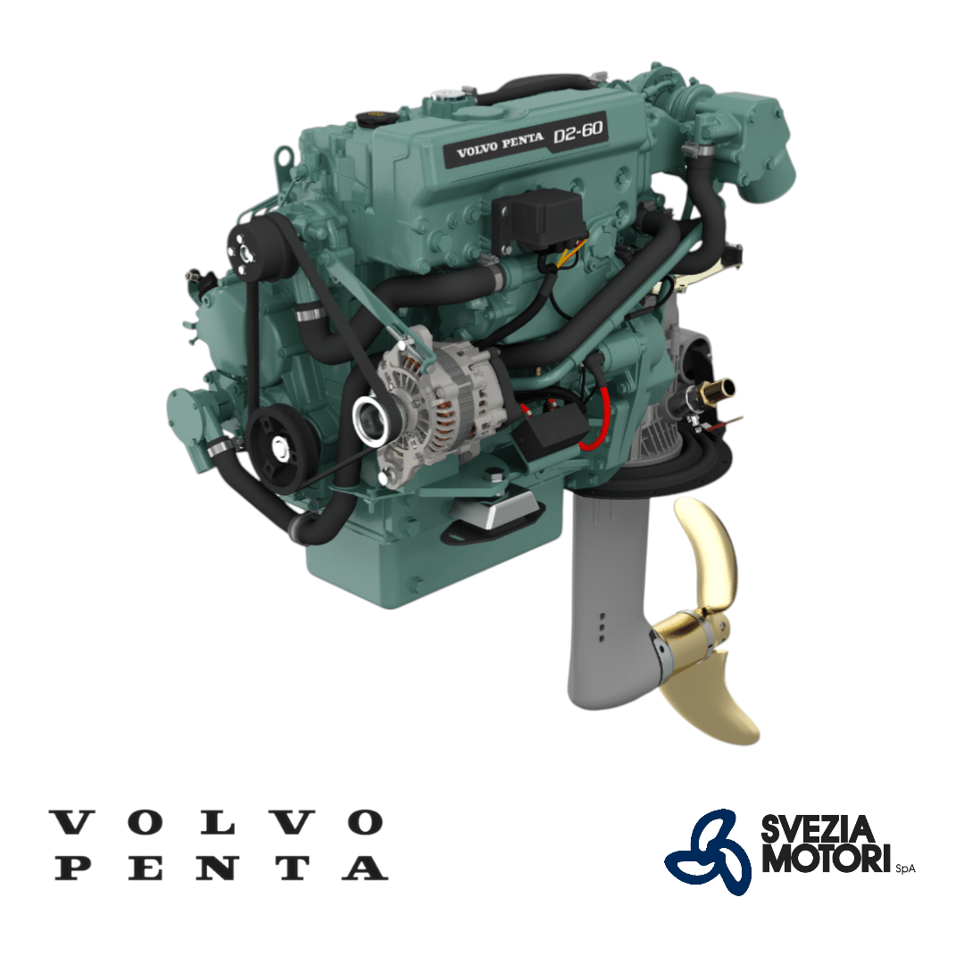 Il Volvo Penta D2-60 con piede Saildrive 150S è un motore diesel entrobordo a 4 cilindri in linea, cilindrata 2.2 litri, dotato di turbo con intercooler (charge air cooler). Eroga 44 kW (60 CV) a 3000 giri/min, garantendo funzionamento silenzioso e vibrazioni minime. Conforme EU RCD Stage II, EPA Tier 3.